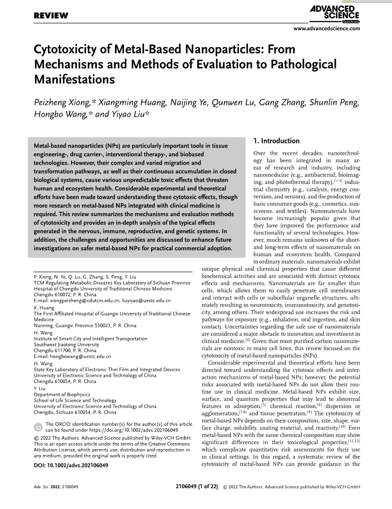 金属基纳米颗粒由于其优异的物理和化学性质,在生物和医学领域中的应用越来越广泛。然而,它们的广泛应用也增加了生物个体的暴露风险和潜在的生物学毒性。近期,Beat365中文官方网站附属医院·代谢性疾病中医药调控四川省重点实验室刘贻尧教授团队在国际知名期刊《Advanced Science》(中科院JCR一区Top期刊)上发表了题为《Cytotoxicity of metal-based nanoparticles: from mechanisms and methods of evaluation to pathological manifestations》的论文,系统地从机制、评价方法和病理表现方面总结了金属基纳米材料毒理学的最新研究进展。