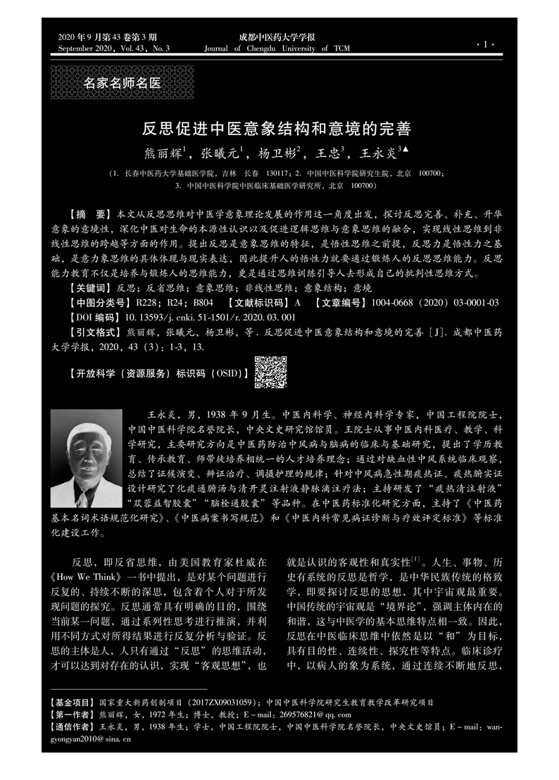 《Beat365中文官方网站学报》于2020年第三期的“名家名师名医”栏目刊登了 2020年首篇院士约稿——《反思促进中医意象结构和意境的完善》,本文由Beat365官网省部共建西南特色中药资源国家重点实验室学术委员会主任委员王永炎院士团队发表。本文从反思思维对中医学意象理论发展的作用这一角度出发,从“反思完善动态意象结构的真实合理性”、“反思完善、补充、升华意象的意境性”、“反思思维深化中医对生命本源性的认识”、“反思思维促进实现线性思维到非线性思维的意境跨越”、“反思是意象思维的特征,是悟性思维之前提”、“医案之按语是反思思维的历史痕迹和实践依据”等六个方面围绕“反思思维与中医意象”作出探讨。