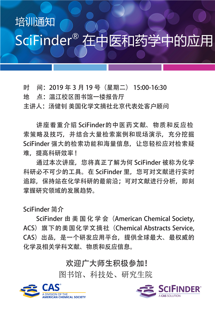 SciFinder在中医和药学中的应用培训通知 发布时间:2019-03-18 14:47:00 浏览次数: 次 【字体:小 大】 【打印正文】 上一条:中国中医药出版社社长范吉平来校开展讲座 下一条:中国科协办公厅关于征集2019重大科学问题和工程技术难题的通知