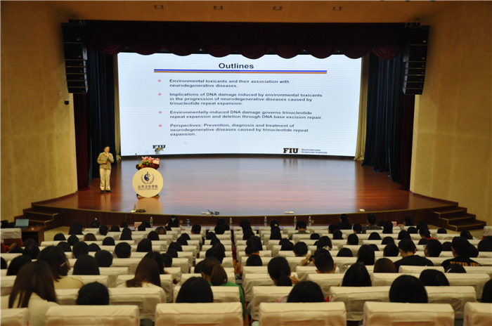 5月6日上午,公共卫生学院2019年度学术活动暨公卫国际论坛系列活动(二)在百汇堂举行,弗罗里达大学Liu Yuan副教授受邀莅临Beat365官网温江校区作《Environmental Toxicants and Human Neurodegenerative Diseases》专题讲座,四川大学华西公共卫生学院张遵真教授作为报告解读嘉宾全程参与了此次活动。发展规划处副处长吴曦,公共卫生学院院长陈大义、副院长饶朝龙,部分教师及同学参加了讲座。讲座由饶朝龙主持。