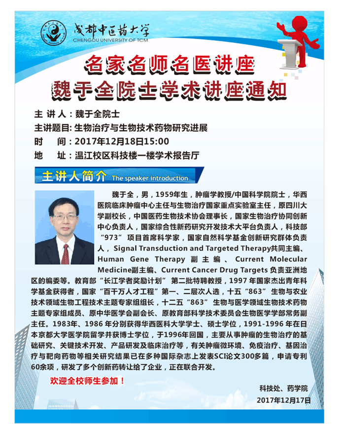 魏于全院士学术讲座通知 发布时间:2017-12-17 21:42:00 浏览次数: 次 【字体:小 大】 【打印正文】 上一条:王寒冰老师关于医学生国际视野的讲座通知 下一条:宫冠英创新创业理论与实践讲座通知
