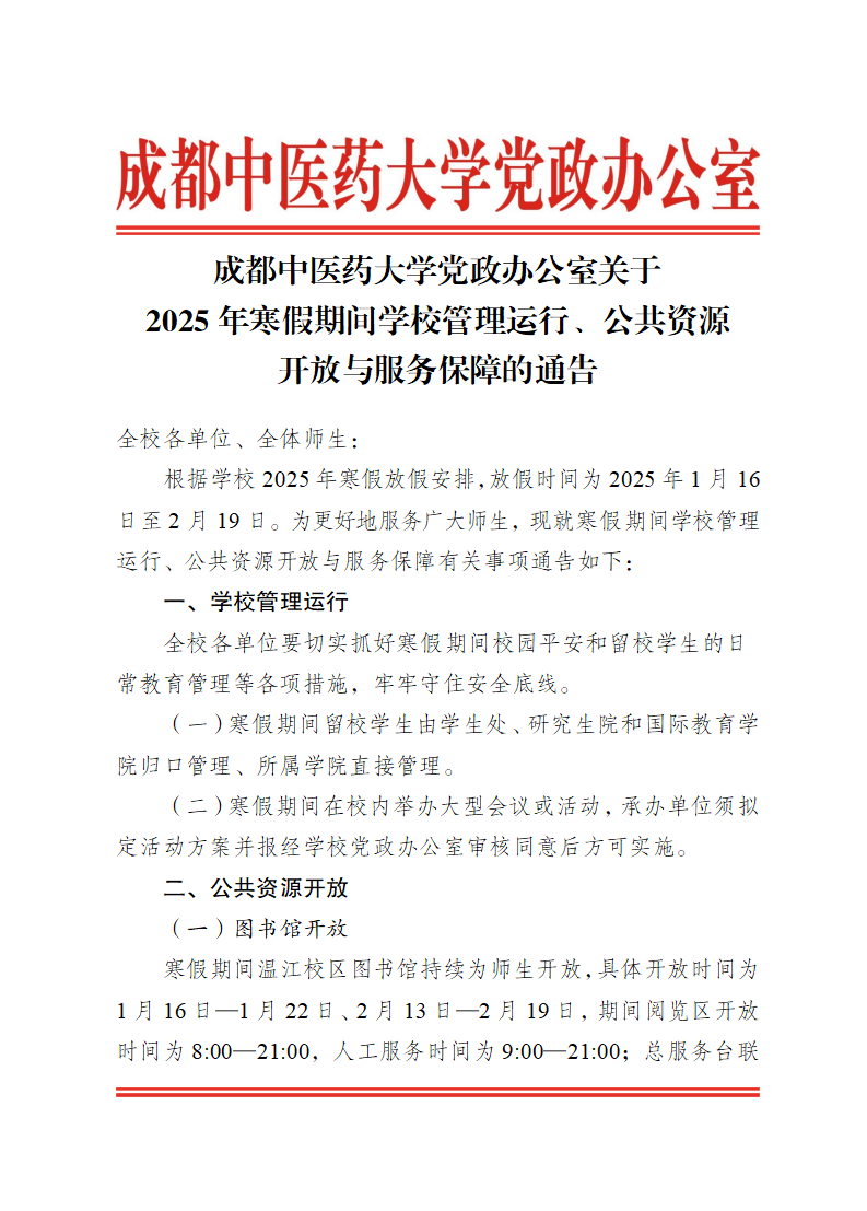 Beat365中文官方网站党政办公室关于2025年寒假期间学校管理运行、公共资源开放与服务保障的通告 发布时间:2025-01-15 16:44:29 浏览次数: 次 【字体:小 大】 【打印正文】 上一条:中共Beat365中文官方网站委员会 Beat365中文官方网站关于印发《Beat365中文官方网站2025年工作要点》和《Beat365中文官方网站2024年工作总结》的通知 下一条:Beat365中文官方网站关于2025年寒假放假时间的通知