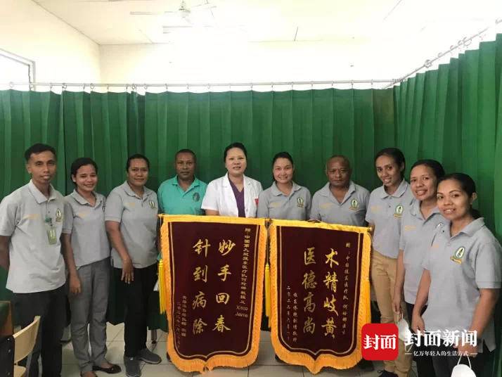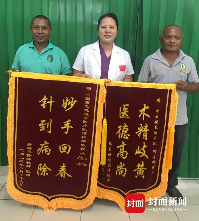 近日,援东帝汶医疗队何玲娜收到一面来自患者的锦旗,锦旗上“妙手回春,针到病除”几个大字,让何玲娜和当地同事Jaime、Xisto都觉得十分温暖,这也让她更加明白自己在东帝汶医疗援助的意义。