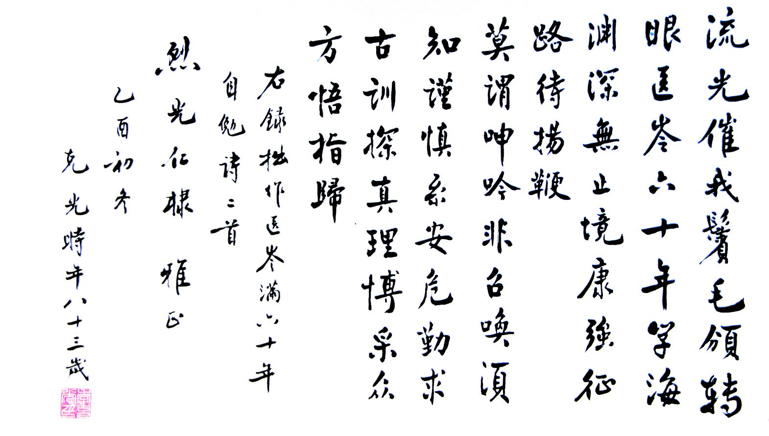 李克光还擅运动以养生。他90余岁时仍经常从家中徒步到成都的古旧书市场,逛街、锻炼、看书,幸运时还能“捡漏”,乐在其中。恩师的运动,非局限于形体之动,他爱好广泛,喜养花、养鱼,又爱好书法、音乐、棋牌等,以爱好促形神之动,从而达到“形与神俱”。李克光喜书法,一生练字不辍,少时摩练颜体、柳体,又学欧阳询、赵孟頫,渐成自身风格。他退休后仍每天习练2小时书法,今届百岁之时,仍能提笔,手不抖、眼不花。