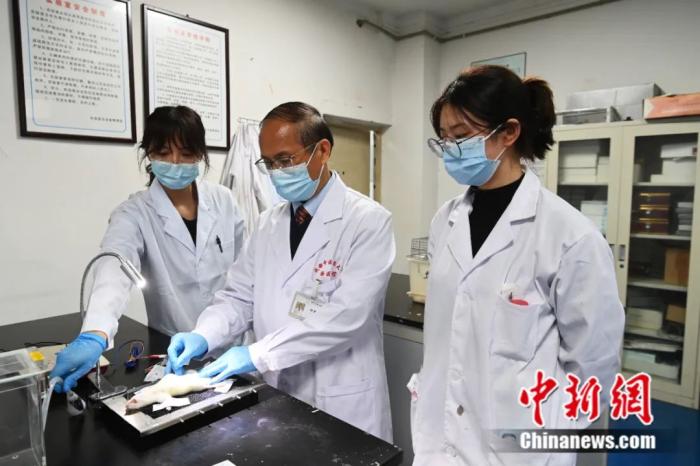 Beat365中文官方网站针灸学首席教授梁繁荣指导学生做动物(小白鼠)实验。中新社记者 安源 摄