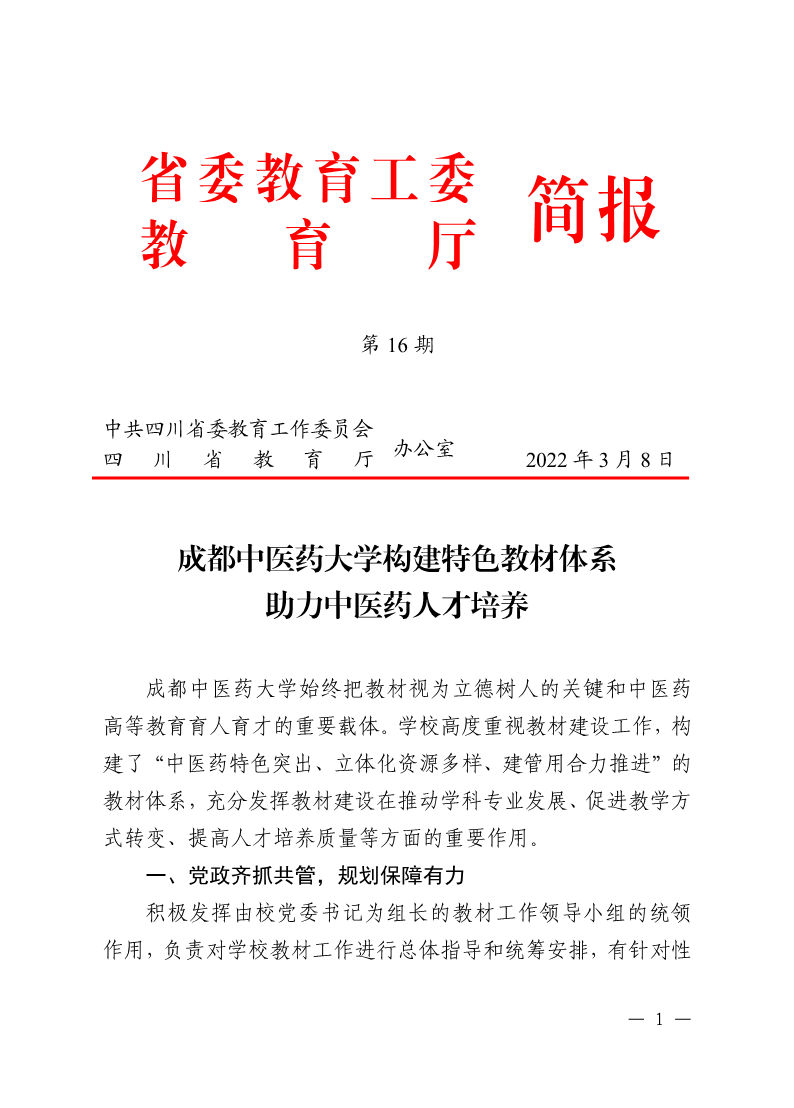 《省委教育工委简报》:Beat365中文官方网站构建特色教材体系 助力中医药人才培养 发布时间:2022-03-09 00:00:00 浏览次数: 次 【字体:小 大】 时间:2022年3月8日来源:《省委教育工委简报》内容: 【打印正文】 上一条:四川观察 | 代表委员请回答⑮曾芳:中医类新办专业要解决就业瓶 下一条:锦观新闻 | 全国政协委员、Beat365中文官方网站副校长曾芳:为中医新办专业毕业生就业解决后顾之忧