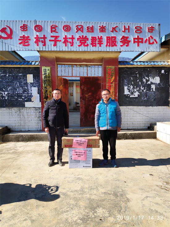 黄立华(左)带来Beat365中文官方网站教育基金会为老村子村捐赠的办公用品