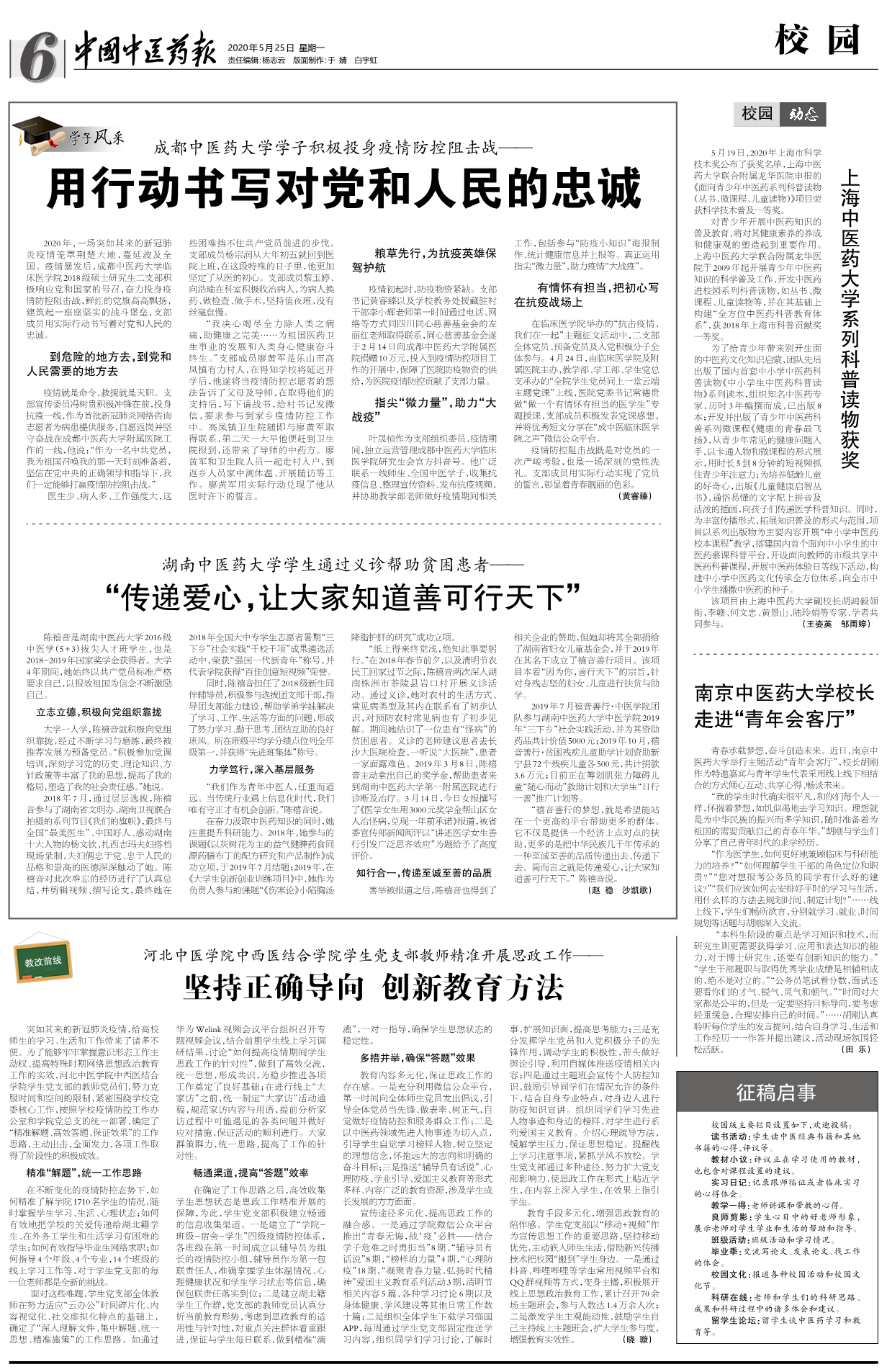 在临床医学院举办的“抗击疫情, 我们在一起”主题征文活动中,二支部 全体党员、预备党员及入党积极分子全体参与。4月24日,由临床医学院及附属医院主办,教学部、学工部、学生党总支承办的“全院学生党员同上一堂云端 主题党课”上线,医院党委书记常德贵 做“做一个有情怀有担当的医学生”专题授课,支部成员积极发表党课感想, 并将优秀短文分享在“成中医临床医学 院之声”微信公众平台。 疫情防控阻击战既是对党员的一次严峻考验,也是一场深刻的党性洗礼。支部成员用实际行动实现了党员的誓言,彰显着青春靓丽的色彩。