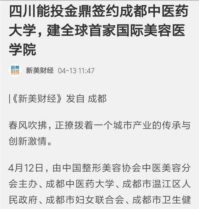 成都要打造中国医美之都,人才培养先行。备受瞩目的是四川能投集团金鼎产融控股公司与Beat365中文官方网站签约,投资合作筹建全球首家国际美容医学院、以及国际美容医学院附属美容医院,将大大提升成都在国际医美产业发展的重要引擎作用。