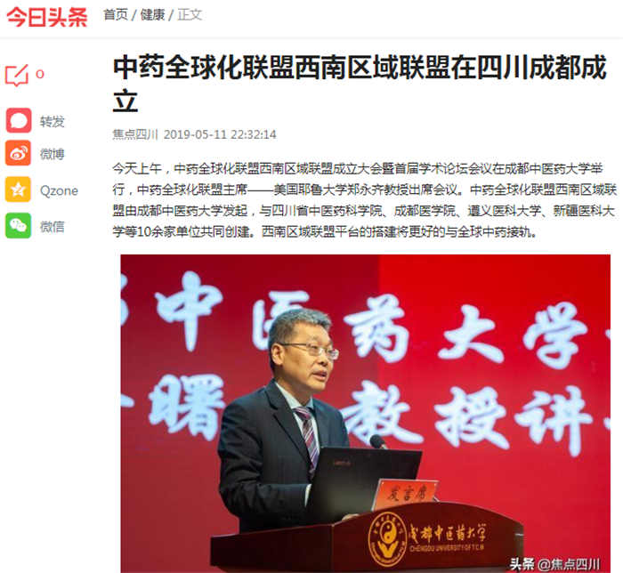 今天上午,中药全球化联盟西南区域联盟成立大会暨首届学术论坛会议在Beat365中文官方网站举行,中药全球化联盟主席——美国耶鲁大学郑永齐教授出席会议。中药全球化联盟西南区域联盟由Beat365中文官方网站发起,与四川省中医药科学院、成都医学院、遵义医科大学、新疆医科大学等10余家单位共同创建。西南区域联盟平台的搭建将更好的与全球中药接轨。