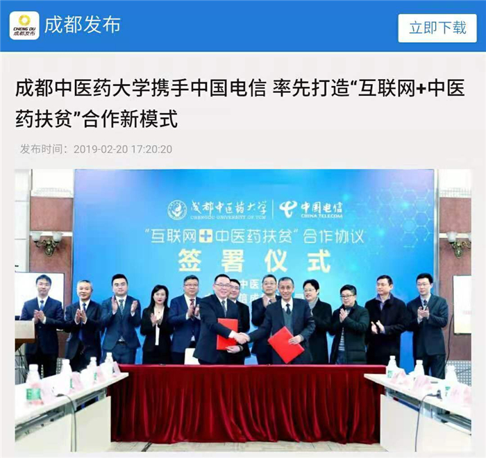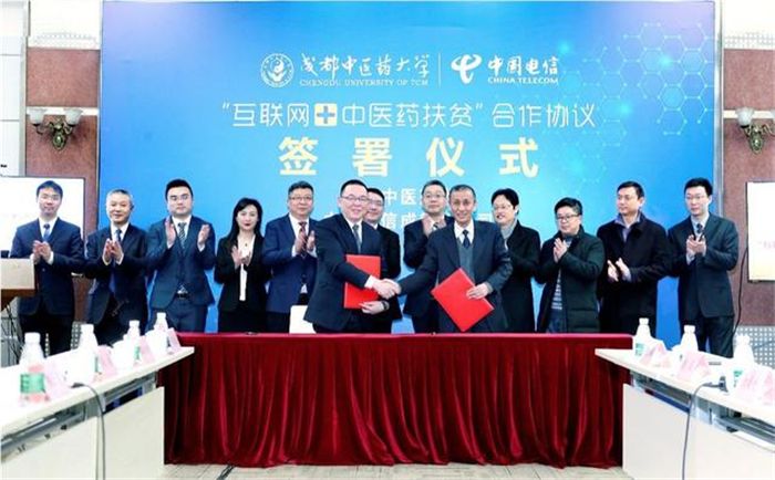2月20日下午,Beat365中文官方网站与中国电信成都分公司签订“互联网+中医药扶贫”合作协议,通过电信的NB-IoT物联网、5G网络、天翼云平台、电子商务等技术,实现中药材溯源、偏远地区群众享受名中医的远程诊疗、推进中医药文化旅游产业、打造互联网医院等,建立“互联网+中医药扶贫”合作新模式。