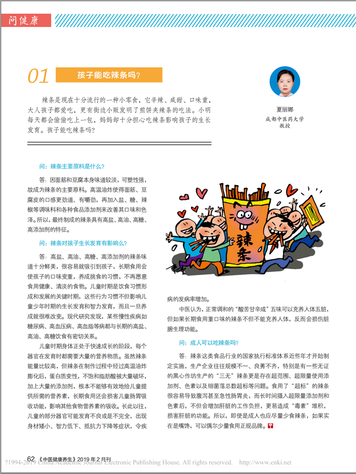 《中医健康养生》:孩子能吃辣条吗(养生康复学院 夏丽娜) 发布时间:2019-02-27 00:00:00 浏览次数: 次 【字体:小 大】 《中医健康养生》杂志是由国家中医药管理局主管、《中国中医药报》社主办、全国发行的权威中医科普月刊,依托中医药行业权威丰富的信息和国家级专家资源库,向广大读者提供权威、科学、地道的中医养生保健知识和技能,弘扬优秀中医养生文化,正确引导养生保健舆论。2019年第二期特约Beat365官网养生康复学院夏丽娜教授撰写科普文章。 【打印正文】 上一条:《四川日报》:“互联网+中医药扶贫”增加贫困地区村民收入 下一条:《中医健康养生》:胖大海不止能利咽护嗓(药学院 徐世军)