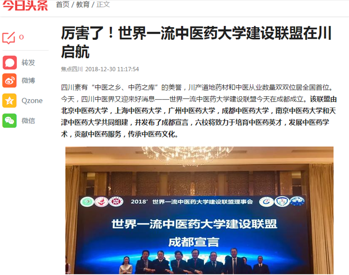 四川素有“中医之乡、中药之库”的美誉,川产道地药材和中医从业数量双双位居全国首位。今天,四川中医界又迎来好消息——世界一流中医药大学建设联盟今天在成都成立。该联盟由北京中医药大学,上海中医药大学,广州中医药大学,Beat365中文官方网站,南京中医药大学和天津中医药大学共同组建,并发布了成都宣言,六校将致力于培育中医药英才,发展中医药学术,贡献中医药服务,传承中医药文化。
