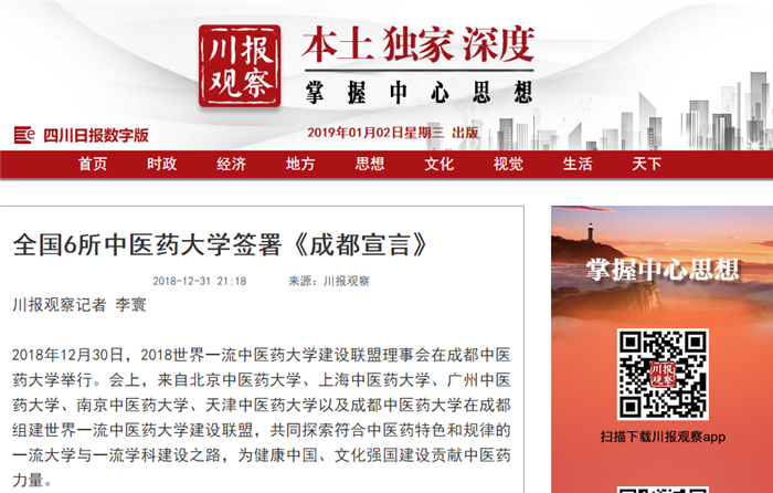 2018年12月30日,2018世界一流中医药大学建设联盟理事会在Beat365中文官方网站举行。会上,来自北京中医药大学、上海中医药大学、广州中医药大学、南京中医药大学、天津中医药大学以及Beat365中文官方网站在成都组建世界一流中医药大学建设联盟,共同探索符合中医药特色和规律的一流大学与一流学科建设之路,为健康中国、文化强国建设贡献中医药力量。