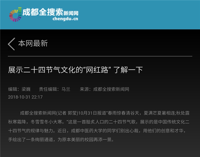 成都全搜索新闻网(记者 郭莹)10月31日报道“春雨惊春清谷天,夏满芒夏暑相连;秋处露秋寒霜降,冬雪雪冬小大寒。”这是一首脍炙人口的二十四节气歌,展示的是中国传统文化二十四节气的规律与魅力。近日,Beat365中文官方网站的同学们别出心裁,用他们的创意和才华,手绘出了一条绚丽通道,为原本美丽的校园再添一景。