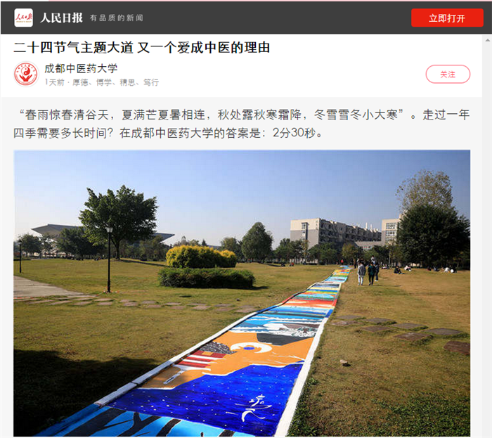日前,一条横跨学校五行大草坪,长138米,宽1.6米的校园通道被学生华丽丽地改装成“二十四节气”文化主题大道,立即成为校园最吸睛的景点。主题大道被分作26块,由西向东,每个节气为一副独立的创意画,24个节气有序衔接,风格多变,内容精致,另有序言后记首尾呼应。