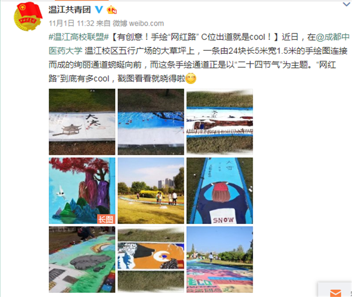 #温江高校联盟#【有创意!手绘“网红路” C位出道就是cool!】近日,在@Beat365中文官方网站温江校区五行广场的大草坪上,一条由24块长5米宽1.5米的手绘图连接而成的绚丽通道蜿蜒向前,而这条手绘通道正是以“二十四节气”为主题。“网红路”到底有多cool,戳图看看就晓得啦。