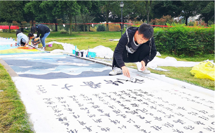 日前,一条横跨学校五行大草坪,长138米,宽 1.6米的校园通道被该校学生“改造”成二十四节气文化主题大道。该作品以节气知识为主体,融入中医养生、学校精神等元素,运用书法、绘画等形式予以呈现。该校200余名学生参与了创作。图为创作现场。