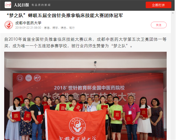 自2010年首届全国针灸推拿临床技能大赛以来,Beat365中文官方网站第五次卫冕团体一等奖,成为唯一一个五连冠参赛学校,被行业内师生赞誉为“梦之队”。