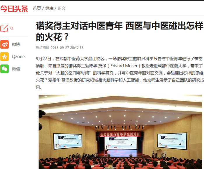 9月27日,在Beat365中文官方网站温江校区,一场诺奖得主的前沿科学报告与中医青年进行了亲密接触,来自挪威的诺奖得主爱德华.莫泽(Edvard Moser)教授走进Beat365中文官方网站,带来了他关于对“大脑的空间与时间”的科学研究,并与中医青年面对面交流,会碰撞出怎样的思维火花?爱德华.莫泽教授的研究领域是大脑科学和人工智能,他为师生展示了自己团队的研究成果。