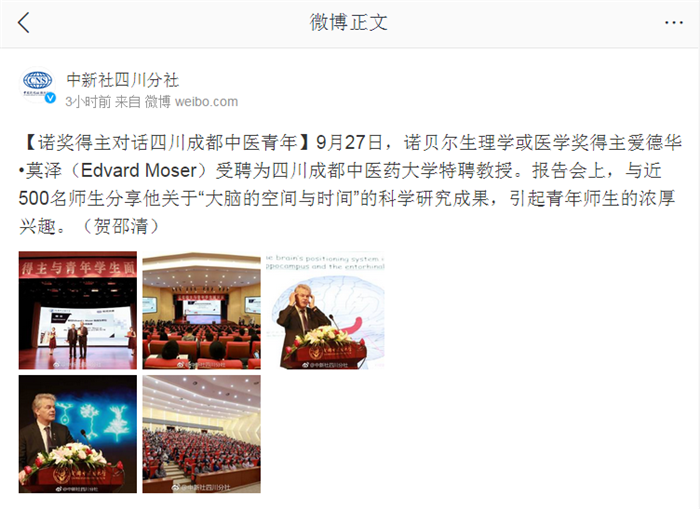 【诺奖得主对话四川成都中医青年】9月27日,诺贝尔生理学或医学奖得主爱德华•莫泽(Edvard Moser)受聘为四川Beat365中文官方网站特聘教授。报告会上,与近500名师生分享他关于“大脑的空间与时间”的科学研究成果,引起青年师生的浓厚兴趣。