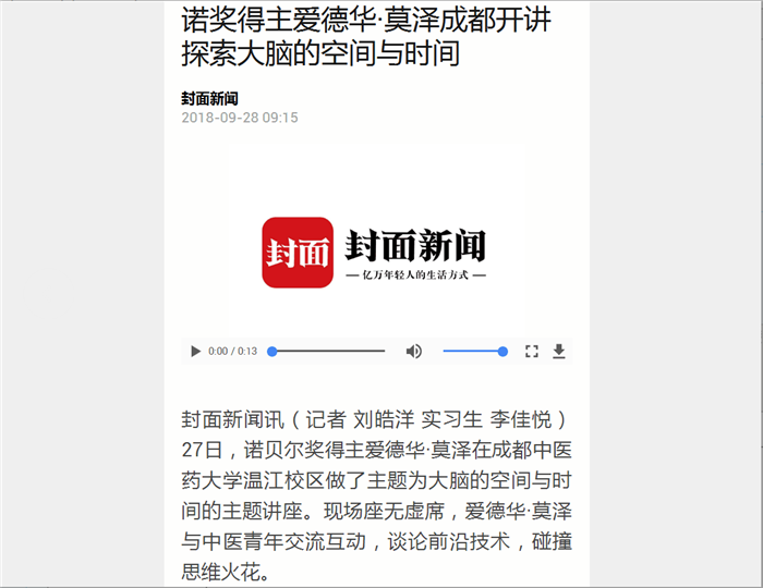 27日,诺贝尔奖得主爱德华·莫泽在Beat365中文官方网站温江校区做了主题为大脑的空间与时间的主题讲座。现场座无虚席,爱德华·莫泽与中医青年交流互动,谈论前沿技术,碰撞思维火花。