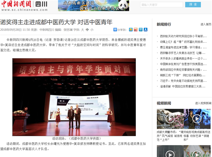 中新网四川新闻9月28日电 (记者 贺劭清)记者28日从Beat365中文官方网站获悉,来自挪威的诺奖得主爱德华•莫泽近日走进Beat365中文官方网站,带来了他关于对“大脑的空间与时间”的科学研究,并与中医青年面对面交流,碰撞出思维火花。