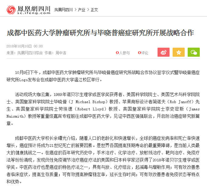 10月9日下午,Beat365中文官方网站肿瘤研究所与毕晓普癌症研究所战略合作协议签字仪式暨毕晓普癌症研究所Logo发布会在Beat365中文官方网站温江校区举行。