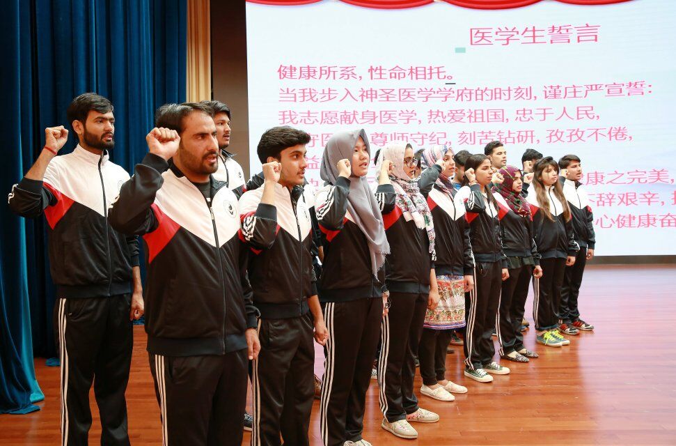 医学与生命科学学院等学院组织了医学生集体宣誓,学院外籍学生也参加了相关活动。