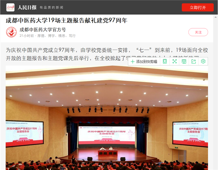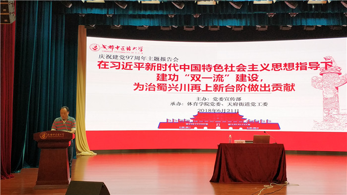 管理学院党委书记杨支才走进医学信息工程学院,以《认识历史新方位,把握矛盾新变化》为主题作习近平新时代中国特色社会主义思想专题学习辅导报告;管理学院党委举行专题党课学习分享会,杨支才做题为《新时代新征程新作为,奋力推进管理学院改革发展》的专题讲座;体育学院党委与天府街道党工委共同举办庆祝建党97周年主题报告会,四川省社会科学院哲学与文化研究所李后卿所长应邀做题为《在习近平新时代中国特色社会主义思想指引下,建功双一流,为治蜀兴川再上新台阶做出新贡献》的报告;外语学院党委邀请马克思主义学院青年教师兰颖讲《中国大国外交新理念:“人类命运共同体”思想》专题党课;附属第二医院(筹)党委书记杨川为党员讲《医改新政背景下更好地为师生健康服务》。