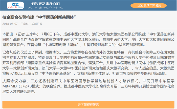 记者从签约仪式上了解到,根据协议,三方将发挥各自在境内外的优势和特色,有机整合与统筹三方在研究机构与专业人才的资源,特别是澳门大学的中药质量研究国家重点实验室与Beat365中文官方网站中药资源系统研究与开发,利用省部共建国家重点实验室培育基地加盟合作,强强联合,共建中华医药创新共同体(包括Beat365中文官方网站—太极创新研究院、澳门大学—太极中华医药创新研究院和重庆太极研究院)。令人振奋的是,太极集团将投入10亿元巨资设立“中华医药创新基金”,支持创新共同体建设,打造世界顶尖的中华医药创新高地。