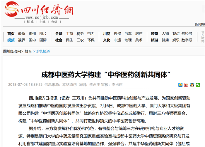 为共同推动中医药科技创新与产业发展,为国家创新驱动发展战略和推动中医药国际发展做出新贡献,7月6日,Beat365中文官方网站、澳门大学和太极集团有限公司构建“中华医药创新共同体”战略合作协议签字仪式在成都举行,届时三方将强强联合,构建“中华医药创新共同体”,共同打造世界顶尖的中华医药创新高地。
