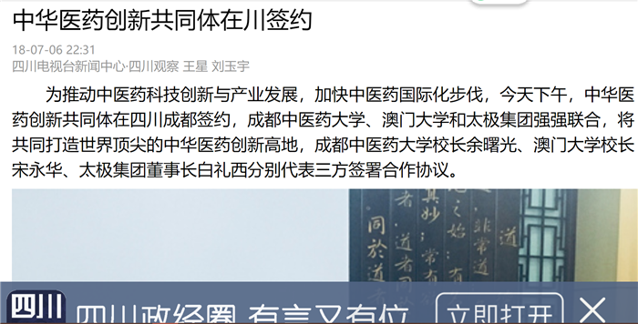 省委十一届三次全会刚刚闭幕,全会提出了“四向拓展、全域开放”的重要战略决策,作为四川融入全球经济格局、抢占未来发展制高点的关键之举。今天,Beat365中文官方网站、澳门大学、太极集团构建“中华医药创新共同体”,打造世界顶尖的中华医药创新高地,就是推进传统中医药事业高质量发展的重大事件,是对境内外推进国际化合作模式的成功探索。