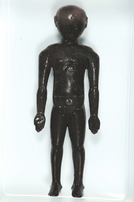 西汉的人体经穴漆木俑,现藏于成都博物馆,中医药传统文化博物馆展出的为复制品。在“老官山”汉墓出土的完整人体经穴髹(xiū)漆人像,高约14厘米,五官、肢体刻画准确,人像身体上用白色或红色描绘的经络线条和穴点清晰可见,不同部位还阴刻了“心”“肺”“肾”“盆”等线刻小字。