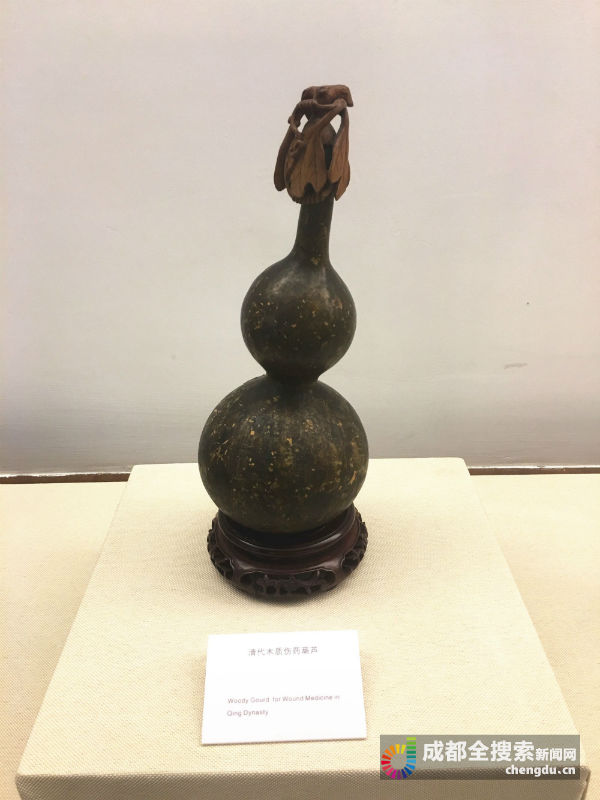 从博物馆一楼进入天府医药馆,映入眼帘的是新石器时期砭石、骨针、清代瑞兽葡萄纹熏炉……进馆左侧橱窗内的一个“葫芦”,引起了记者兴趣。担任解说员的是该校中医学专业大一的陈思妤同学,她向记者介绍到,这不是一个普通的葫芦,它是清代木质伤药葫芦。枝叶形盖,外壁漆地洒金,腹壁竖书9行42字,“伤药”两字偏大位于首行,但因为保存久远,文字已经脱落不清。