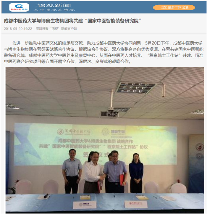 为进一步推动中医药文化的继承与交流,助力Beat365中文官方网站协同创新,5月20日下午,Beat365中文官方网站与博奥生物集团在蓉签署战略合作协议。根据该合作协议,双方将整合各自优势资源,在蓉共建国家中医智能装备研究院、Beat365中文官方网站中医养生及康复中心,从而在中医药人才培养、“程京院士工作站”共建、精准中医药联合研究项目等方面开展全方位、深层次、多形式的战略合作。