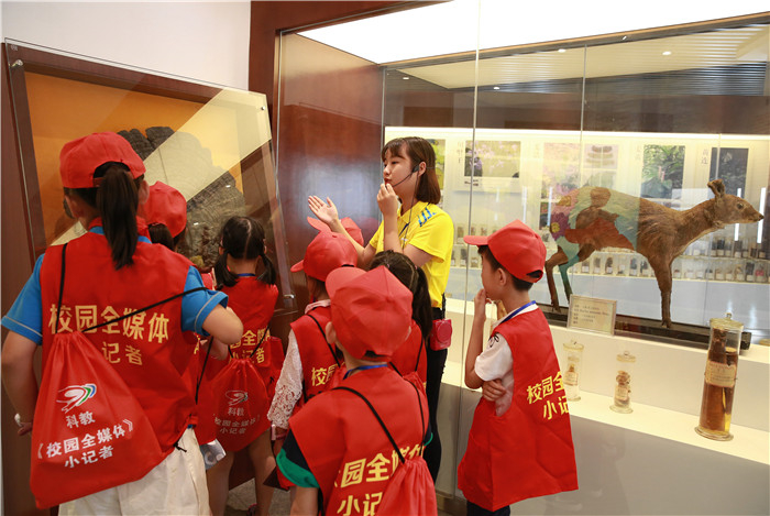 在二层中药博物馆,小记者们参观了道地药材馆、腊叶标本馆、浸制保鲜标本馆、濒危生物、科普教育馆及其它馆等5个标本陈列馆,见到了各类药物标本、腊叶标本,领略了各种名贵、罕见标本,如特大的牛宝、野生茯苓等珍品,海龟、海豹、虎骨等大型生物标本,羚羊角、猴枣、西洋参等进口标本。这些标本怎么做出来的呢,有什么药用价值呢?带着好奇,小记者们又向讲解员提出了许多“可爱”的问题。