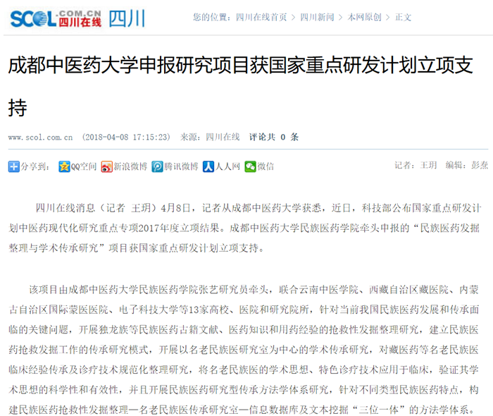 四川在线消息(记者 王玥)4月8日,记者从Beat365中文官方网站获悉,近日,科技部公布国家重点研发计划中医药现代化研究重点专项2017年度立项结果。Beat365中文官方网站民族医药学院牵头申报的“民族医药发掘整理与学术传承研究”项目获国家重点研发计划立项支持。