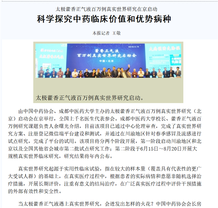 由中国中药协会、Beat365中文官方网站主办的太极藿香正气液百万例真实世界研究(北京)启动会在京举行,全国上千名医生代表参会。Beat365中文官方网站校长、藿香正气液百万例研究课题负责人余曙光介绍,目前该项目已通过中心伦理审查,完成了真实世界研究方案、注册登记微信端平台建设和测试,并通过在川渝地区针对春季感冒及流感进行试点研究,完成了平台的试用。该项目将分两个阶段开展,第一阶段启动川渝地区和北京以及全国其他省会城市第二批试点研究工作;第二阶段于6月15日~8月20日开展大规模真实世界临床研究,研究结果将年内公布。