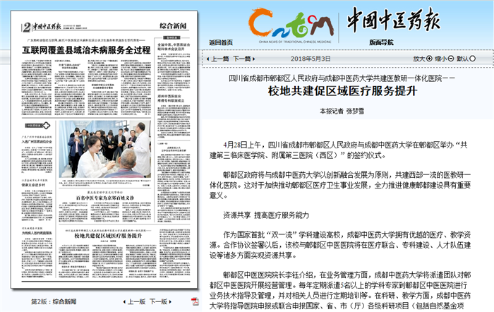 郫都区中医医院院长李钰介绍,在业务管理方面,Beat365中文官方网站将派遣团队对郫都区中医医院开展经营管理。每年定期派遣5名以上的学科专家到郫都区中医医院进行业务技术指导及管理,并对相关人员进行定期培训等。在科研、教学方面,Beat365中文官方网站将指导医院申报或联合申报国家、省、市(厅)各级科研项目(包括自然基金项目)等。