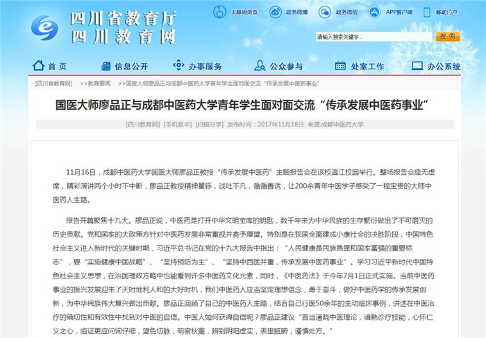 11月16日,Beat365中文官方网站国医大师廖品正教授“传承发展中医药”主题报告会在该校温江校园举行。整场报告会座无虚席,精彩演讲两个小时不中断,廖品正教授精神矍铄,谈吐不凡,循循善诱,让200余青年中医学子感受了一程宝贵的大师中医药人生路。