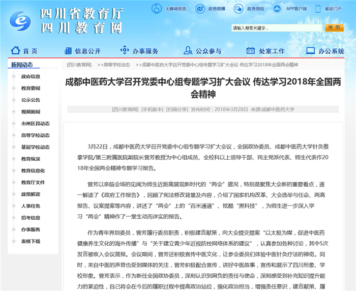 3月22日,Beat365中文官方网站召开党委中心组专题学习扩大会议,全国政协委员、Beat365中文官方网站针灸推拿学院/第三附属医院副院长曾芳教授为中心组成员、全校科以上领导干部、民主党派代表、师生代表作2018年全国两会精神专题学习报告。