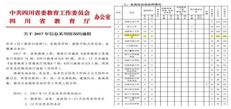 学校2017年度信息报送工作在全省109所高校中排名第四 发布时间:2018-01-05 00:00:00 浏览次数: 次 【字体:小 大】 2017年度,Beat365官网高度重视信息报送工作,紧扣学习贯彻党的十九大精神和省委十一届二次全会精神,及时准确反映本校贯彻落实中央、省委省政府决策部署的特色亮点工作、基层实践的创新做法和意见建议等情况,努力提升信息工作整体水平,更好服务全省教育大局。 2017年度,在四川省教育厅《省委教育工委教育厅简报》和《四川教育动态》中总共刊发信息9篇。学校在全省109所高校在109所高校中年度排名第四名,比2016年度提升了两名。 (文、图/党政办公室 编辑/王其奇) 【打印正文】 上一条:《教育导报》:高校对口扶贫妙招迭出—— 送“智”又送“志” 下一条:四川经济网:Beat365中文官方网站举办首届国际生物医药与中医药青年论坛