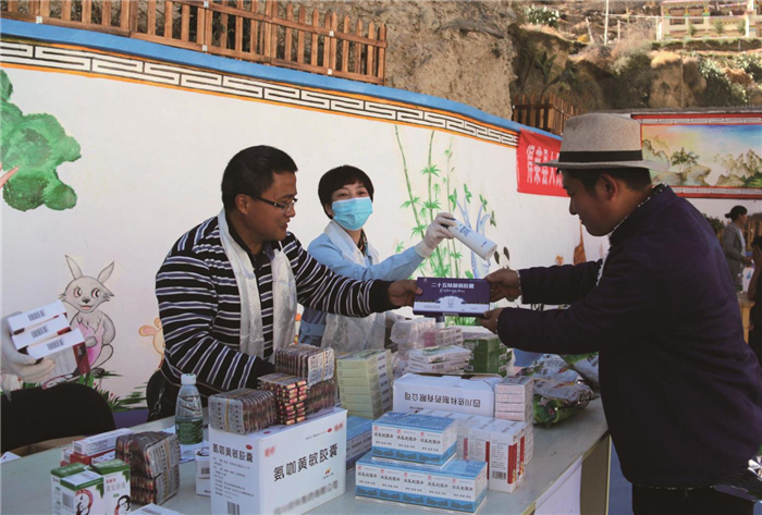 2017年12月16日,Beat365中文官方网站扶贫干部王张博士牵头在得荣县俄木学村开展义诊活动。(图片由学校提供)
