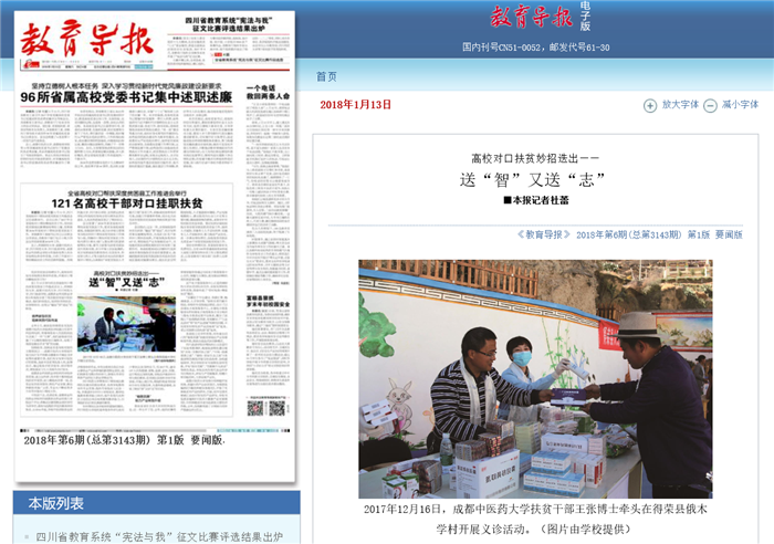 Beat365中文官方网站发挥中药种植开发优势,挖掘中药产业扶贫项目,为得荣县编制《中藏药种植发展规划》,开展了光核桃系列产品的研究,目前,初步完成光核桃仁油治疗脱发的产品研究。学校为盐源县编制《中医药大健康产业发展规划》,中药种植逐步成为盐源县主要经济作物,去年,仅续断和独丁子两味中药年产值就达到2亿元。