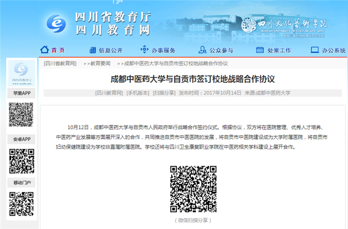 10月12日,Beat365中文官方网站与自贡市人民政府举行战略合作签约仪式。根据协议,双方将在医院管理、优秀人才培养、中医药产业发展等方面展开深入的合作,共同推进自贡市中医医院的发展,将自贡市中医院建设成为大学附属医院,将自贡市妇幼保健院建设为学校非直属附属医院。学校还将与四川卫生康复职业学院在中医药相关学科建设上展开合作。