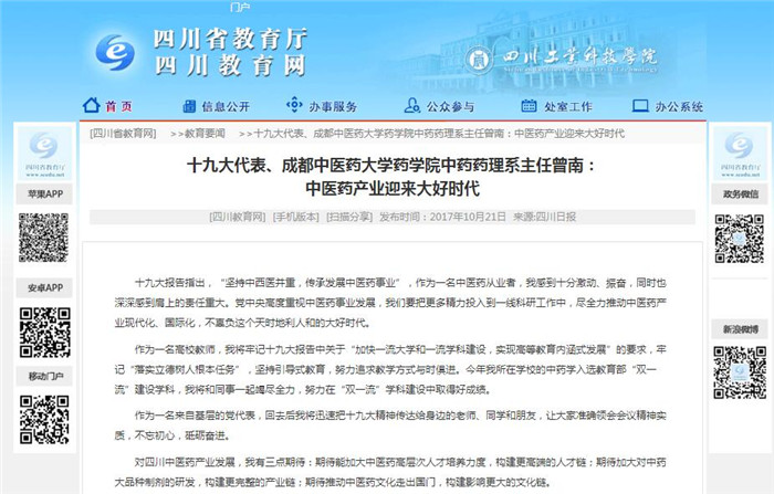 十九大代表、Beat365中文官方网站药学院中药药理系主任曾南:中医药产业迎来大好时代
