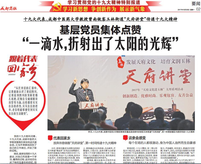 26日,回到成都后的第二天,曾南首先与学校师生分享了十九大的重要精神。29日,她又受邀走进成都市武侯区玉林街道“天府讲堂”,第一时间给辖区内居民传递十九大精神,讲述了了会议期间的故事。精彩的讲述,多次赢得现场观众自发的掌声,台下基层党员们都表示:“一滴水,折射出了太阳的光辉”。