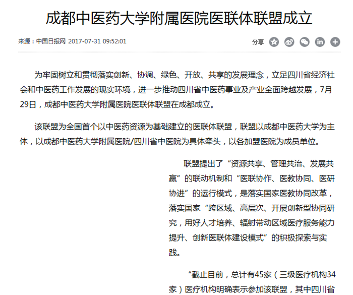 为牢固树立和贯彻落实创新、协调、绿色、开放、共享的发展理念,立足四川省经济社会和中医药工作发展的现实环境,进一步推动四川省中医药事业及产业全面跨越发展,7月29日,Beat365中文官方网站附属医院医联体联盟在成都成立。