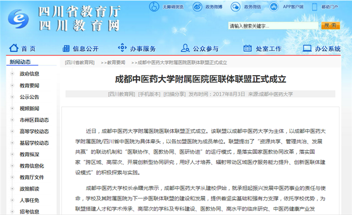 同近日,Beat365中文官方网站附属医院医联体联盟正式成立。该联盟以Beat365中文官方网站为主体,以Beat365中文官方网站附属医院/四川省中医院为具体牵头,以各加盟医院为成员单位。联盟提出了“资源共享、管理共治、发展共赢”的联动机制和“医联协作、医教协同、医研协进”的运行模式,是落实国家医教协同改革,落实国家“跨区域、高层次、开展创新型协同研究,用好人才培养、辐射带动区域医疗服务能力提升、创新医联体建设模式”的积极探索与实践。